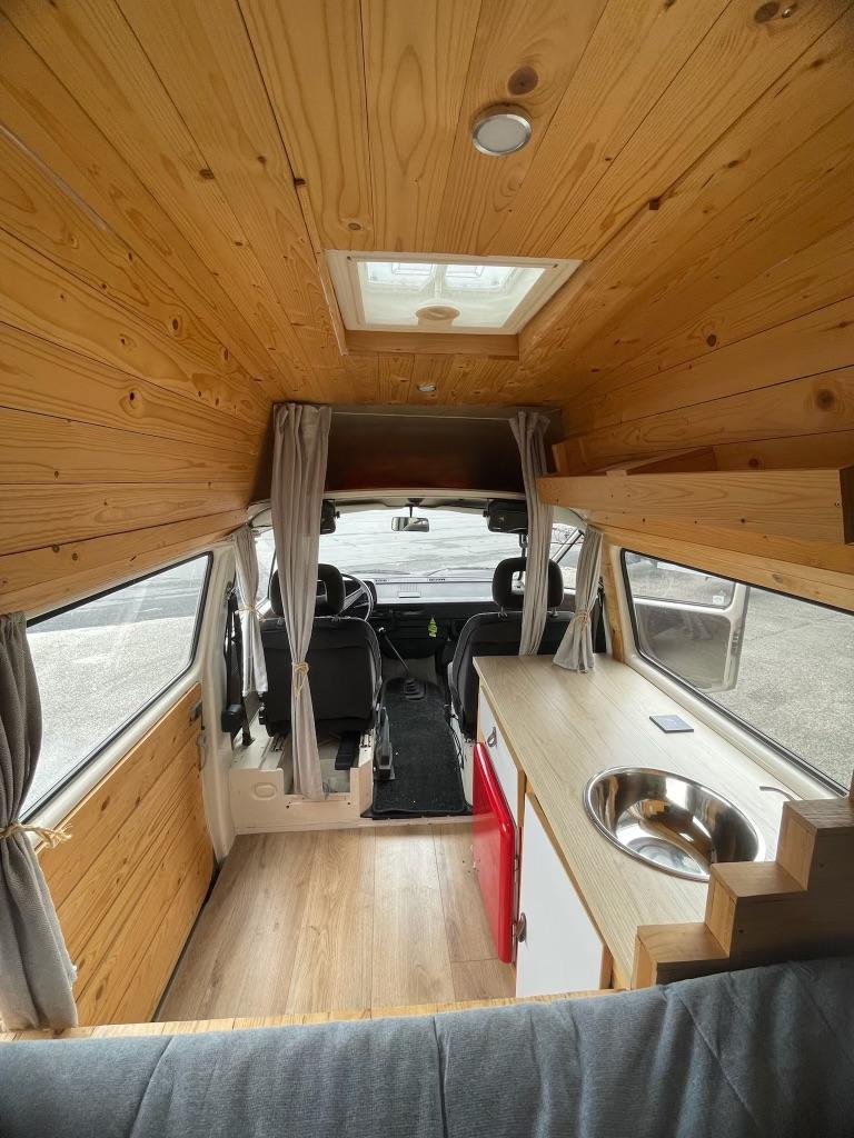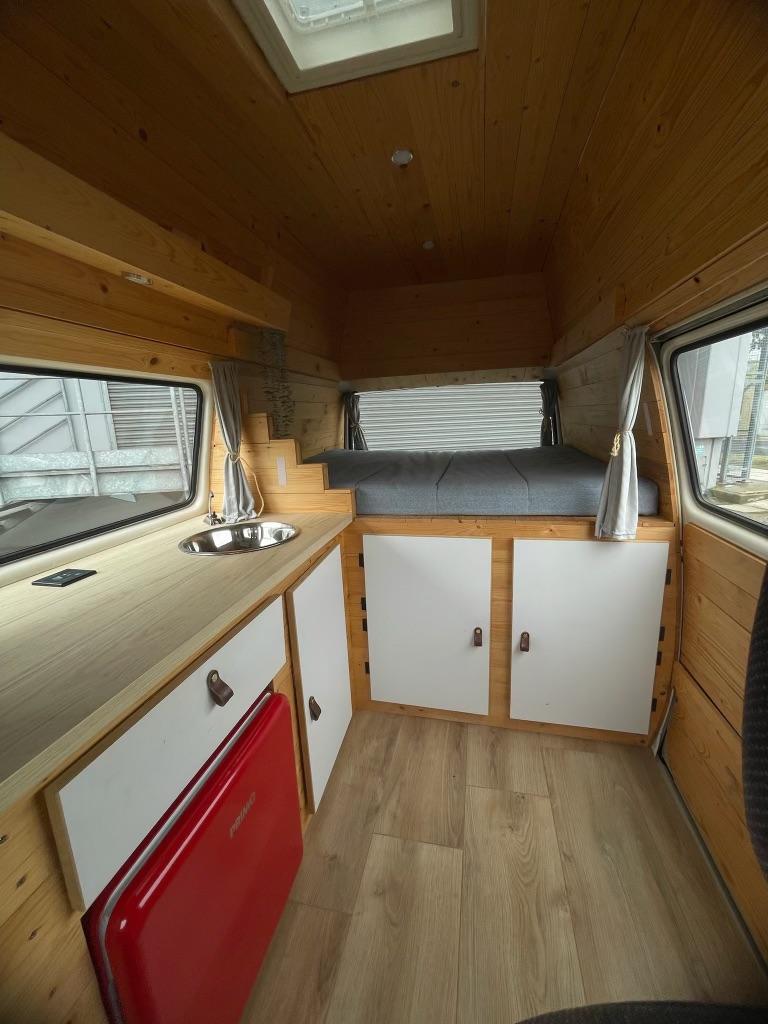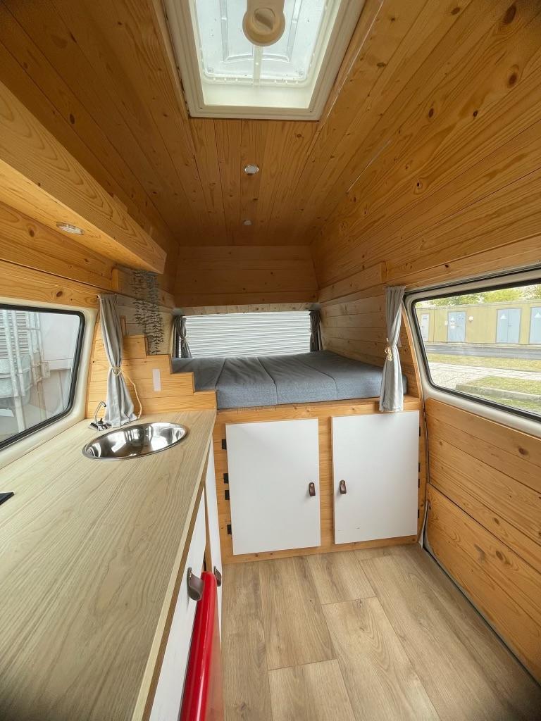 UNICO PROPRIETARIO. Meticolosamente allestito con interno accogliente in legno, coibentazione termica. Dotato di letto estraibile, cucina organizzata (lavello, piano di lavoro in legno, armadietti) e frigorifero rosso vintage.